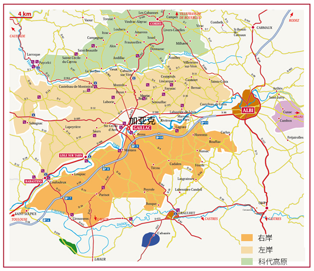 加亞克的3大主要子產(chǎn)區(qū)分別為右岸(Rive Droite)、左岸(Rive Gauche)和科代高原(Plateau Cordais)。其中位于塔恩河(Tarn River)以南的右岸產(chǎn)區(qū)地勢高,可俯瞰整個塔恩河。該產(chǎn)區(qū)的葡萄園以黏土和石灰?guī)r土壤為主,出產(chǎn)著優(yōu)質(zhì)的莫札克和布洛可。其中由莫札克釀成的酒既有優(yōu)雅柔順且回味悠長的干型白葡萄酒,又有芳香馥郁的甜酒,而布洛可紅葡萄酒則充滿水果和香料風(fēng)味。塔恩河以北的左岸產(chǎn)區(qū)地勢較低,以鵝卵石、砂土和礫石為主,有著孕育優(yōu)質(zhì)紅葡萄酒的杰出風(fēng)土。這里出產(chǎn)的杜拉斯紅葡萄酒風(fēng)格強勁有力、單寧圓潤,而白葡萄酒雖不比右岸的脆爽,但采用蘭德樂釀成的白葡萄酒卻有著出色的復(fù)雜度。此外,該產(chǎn)區(qū)還出產(chǎn)著品質(zhì)優(yōu)異的遲摘(Late Harvest)葡萄酒。位于加亞克北部的科代高原以石灰?guī)r為主,其出產(chǎn)的白葡萄酒擁有清新的花香和果香,紅葡萄酒口感平衡、適宜陳年,桃紅葡萄酒果味芳香、酒體輕盈。