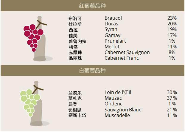 加亞克產(chǎn)區(qū)使用的法定葡萄品種共有13種,其中紅葡萄品種有8種:布洛可(Braucol)、杜拉斯(Duras)、西拉(Syrah)、佳美(Gamay)、普魯內(nèi)拉(Prunelart)、梅洛(Merlot)、赤霞珠(Cabernet Sauvignon)和品麗珠(Cabernet Franc),而白葡萄品種則共有5種:蘭德樂(Len de l'El/Loin de L’Oeil )、莫札克(Mauzac)、昂登(Ondenc)、長相思(Sauvignon Blanc)和密斯卡岱(Muscadelle)。
