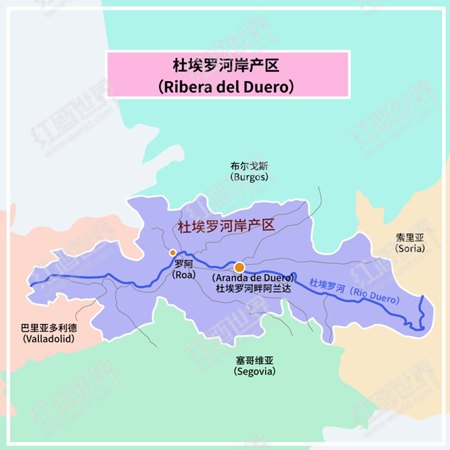 杜埃羅河岸位于伊比利亞半島(Iberian Peninsula)北部的高地,是卡斯蒂利亞-萊昂自治區(qū)(Castilla y Leon)的著名子產(chǎn)區(qū)。該產(chǎn)區(qū)沿杜埃羅河(Rio Duero)及其支流分布,在行政區(qū)劃上涉及索里亞(Soria)、布爾戈斯(Burgos)、巴利亞多利德(Valladolid)和塞哥維亞(Segovia)這四個(gè)省。產(chǎn)區(qū)葡萄園占地約22,500公頃,多分布于海拔760至945米的高地,且集中在河岸朝北或朝南的山坡上。