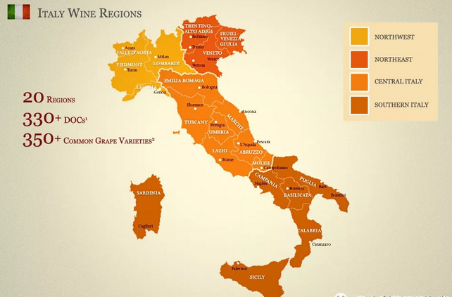 這些意大利的最好產(chǎn)區(qū)多來自Piemonte及Toscana此兩大酒區(qū), 意大利傳統(tǒng)四大名酒各有二種歸屬其下:Barolo(巴羅洛)及Barbaresco(爸爸來思考)酒區(qū)來自Piemonte; Brunello di Montalcino(布尼老)及Vino Nobile di Montepulciano(貴族紅)來自Toscana。