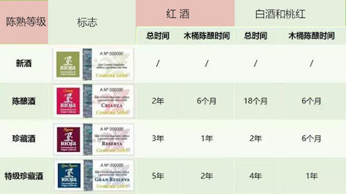 其中,里奧哈葡萄酒又分為Generic(原產地/新酒), Crianza(陳釀), Reserva(珍藏)和Gran Reserva(特級珍藏)。上述四個等級都是以橡木桶陳釀與瓶陳時間進行的劃分。