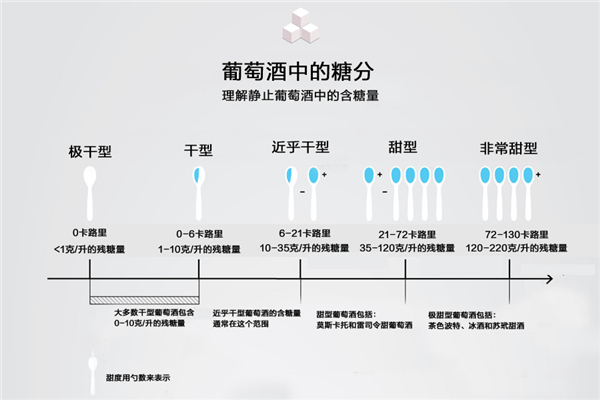 國(guó)際上還有一種通用的量化方法,那就是用勺數(shù)來(lái)表示,詳見(jiàn)下圖。一個(gè)標(biāo)準(zhǔn)勺為 1 盎司(約等于 28.35 克),如下圖所示,干型的殘?zhí)橇糠秶恍蜗蟮谋硎緸?0 勺到 1/3 勺之間,近乎干殘?zhí)橇康姆秶槐硎緸?1/3 勺至1勺+之間。