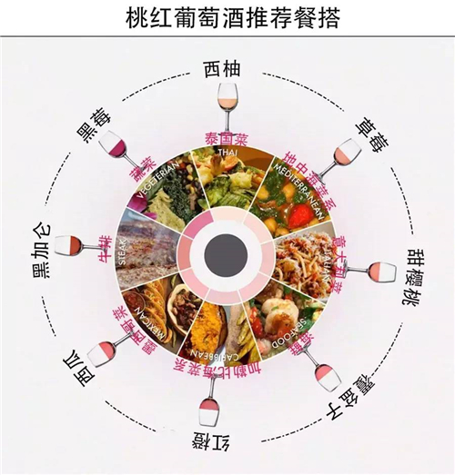桃紅葡萄酒是“配餐小能手”,幾乎能與所有的菜肴搭配。為方便各位對桃紅葡萄酒和各種菜肴進(jìn)行搭配,下圖是各種桃紅葡萄酒推薦搭配的菜肴。