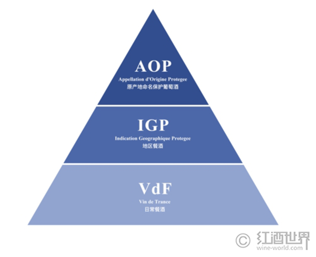 后來(lái)為了響應(yīng)歐盟的改革并配合歐洲農(nóng)產(chǎn)品級(jí)別標(biāo)注形式,法國(guó)于2012年推出新的分級(jí)體系——原產(chǎn)地命名保護(hù)制度(Appellation d'Origine Protegee,簡(jiǎn)稱(chēng)AOP)。這個(gè)體系從高至低包含原產(chǎn)地命名保護(hù)葡萄酒(AOP)、地區(qū)餐酒(Indication Geographique Protegee/IGP)與日常餐酒(Vin de France/VdF)三個(gè)級(jí)別,分別取代原來(lái)的AOC、VdP和VdT,并撤銷(xiāo)了VDQS 這一等級(jí),原有的 VDQS 葡萄酒或升級(jí)為AOP,或降級(jí)為VdF。
