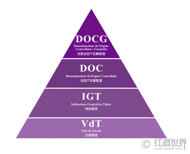 上世紀(jì)60年代之前,意大利尚沒(méi)有確立行之有效的葡萄酒分級(jí)制度,消費(fèi)者難以在種類(lèi)繁多的意大利葡萄酒中甄別出優(yōu)質(zhì)佳釀,這很大程度上阻礙了意大利葡萄酒在國(guó)際市場(chǎng)上的發(fā)展。于是從1963年開(kāi)始,意大利便逐步建立并完善其葡萄酒分級(jí)體系,把葡萄酒劃分為4個(gè)品質(zhì)級(jí)別。