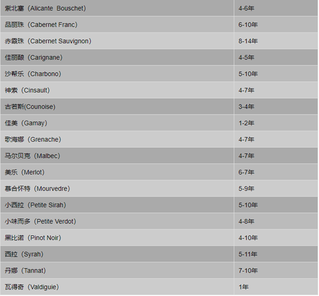 然而,即使是在超市里面,我們還是能夠輕易買到具備陳年潛力的葡萄酒,特別是紅葡萄酒(當(dāng)然這些酒大多價格不菲)。具體而言,一瓶葡萄酒的陳年潛力基本上取決于其葡萄品種,不同的葡萄品種其“適飲期”也大不一樣。以下是一份各主要紅葡萄品種的適飲期指南,可供各位葡萄酒愛好者參考: