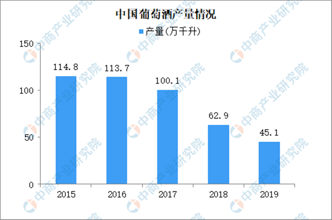 近五年葡萄酒產量接連下滑,2015年葡萄酒產量108.8萬千升,2019年跌至45.1萬千升,跌幅60.7%。