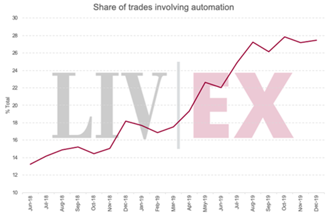 如下圖所示,在過去的18個月,在Liv-ex上涉及自動化的交易數(shù)量一直上升。
