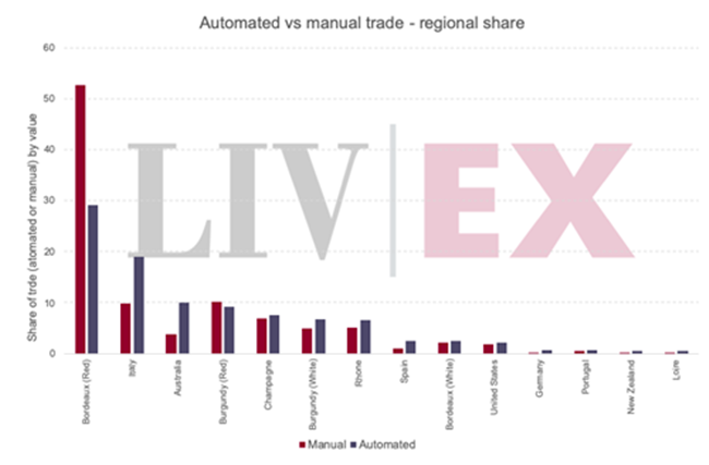 下圖按酒區(qū)來顯示手動和自動交易的比例。 由此可見,波爾多等傳統(tǒng)酒區(qū)在采用前者的比例要比后者高得多。