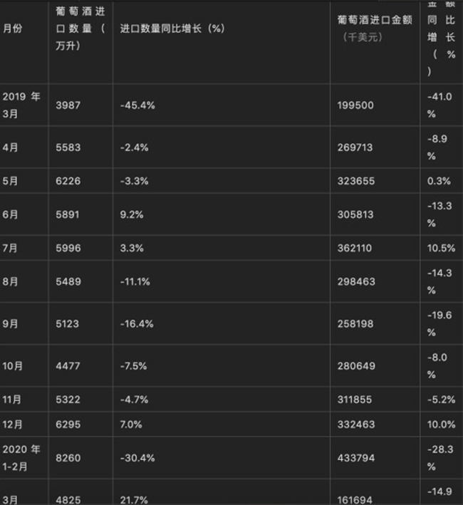 單從2020年3月來看,中國葡萄酒進口量為4825萬升,同比增長21.7%;進口金額為161694千美元,同比下降14.9%。
