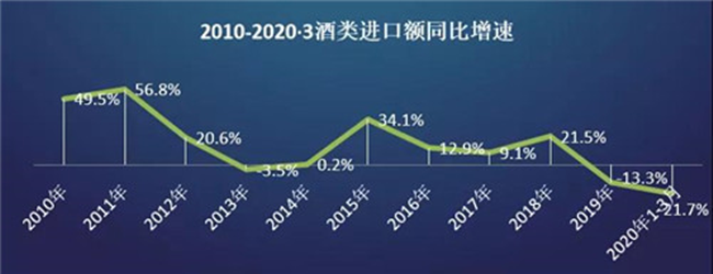 2020年一季度,中國(guó)進(jìn)口酒類(lèi)金額8.7億美元,同比下降21.7%。2010—2019年,十年間的年均復(fù)合增長(zhǎng)率為13.8%。