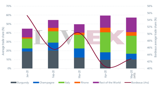 意大利成為了最耀眼的新星。上月,該酒區(qū)的交易份額升至22.5%的歷史新高;部分是由于免美國關稅、以及廣受好評的布魯諾Brunello ’15年和巴羅洛Barolo ’16的發(fā)布活動所推動。 羅納(5.2%)和“世界其它酒區(qū)”(13.3%)的交易份額也有增加。