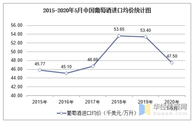 2015-2020年5月中國葡萄酒進口均價統(tǒng)計圖