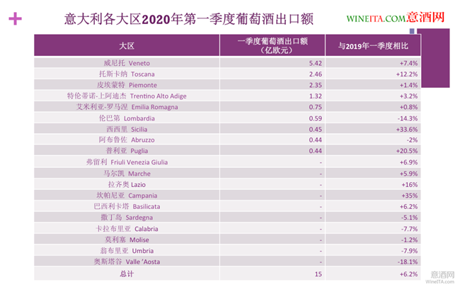 細(xì)分到各大區(qū),2020年第一季度葡萄酒出口額排名前三位的依次是威尼托大區(qū)(Veneto)、托斯卡納大區(qū)(Toscana)和皮埃蒙特大區(qū)(Piemonte)。