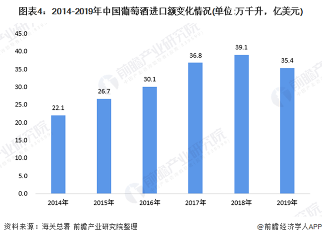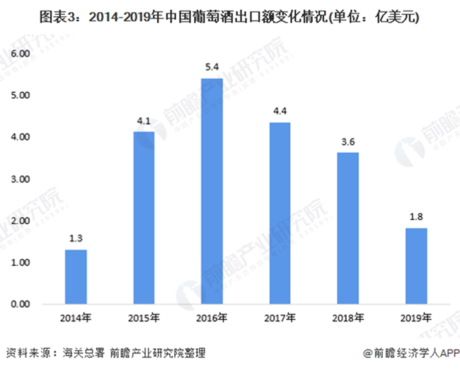 海關(guān)數(shù)據(jù)顯示,2019年,受行業(yè)景氣程度影響,我國(guó)葡萄酒進(jìn)出口額均有所下降,進(jìn)口額實(shí)現(xiàn)35.4億美元,出口額實(shí)現(xiàn)1.8億美元,進(jìn)口額跌幅高于出口額。整體進(jìn)出口總額降為37.2億美元,實(shí)現(xiàn)貿(mào)易逆差33.6億美元。
