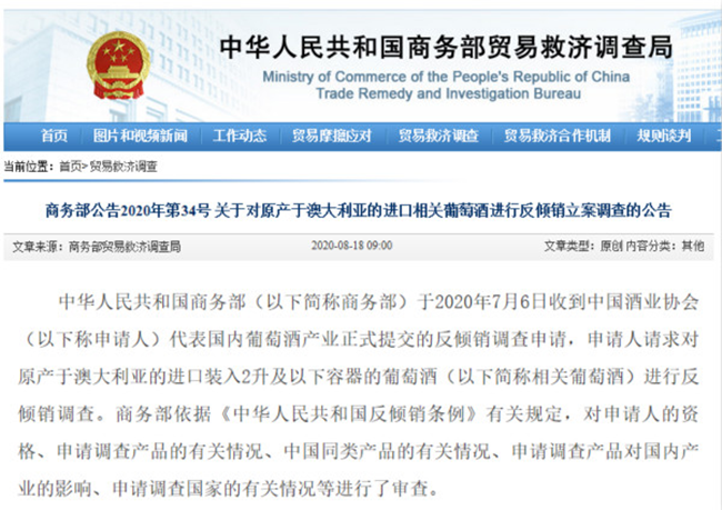 根據(jù)上述審查結(jié)果,依據(jù)《中華人民共和國(guó)反傾銷(xiāo)條例》第十六條的規(guī)定,商務(wù)部決定自2020年8月18日起對(duì)原產(chǎn)于澳大利亞的進(jìn)口相關(guān)葡萄酒進(jìn)行反傾銷(xiāo)立案調(diào)查。現(xiàn)將有關(guān)事項(xiàng)公告如下: