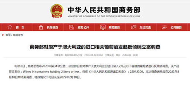 8月18日,商務(wù)部發(fā)布2020年第34號公告,決定即日起對原產(chǎn)于澳大利亞的進(jìn)口裝入2升及以下容器的葡萄酒進(jìn)行反傾銷調(diào)查。