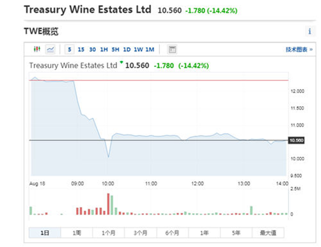 澳大利亞葡萄酒巨頭富邑葡萄酒集團(tuán)(Treasury Wine Estates)發(fā)表聲明稱,將配合中國相關(guān)部門新宣布的對澳大利亞向中國出口葡萄酒的反傾銷調(diào)查。但僅在該聲明發(fā)表后不久,該企業(yè)股價(jià)便迎來斷崖式下跌,盤中股價(jià)一度跌至10.050澳幣,截止收盤,報(bào)10.560澳幣,下跌14.42%。