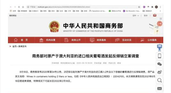 首先是中國對澳大利亞葡萄酒展開為期幾個(gè)月的反傾銷調(diào)查,一旦傾銷被認(rèn)證,中國可能對澳大利亞葡萄酒加征懲罰性關(guān)稅,關(guān)稅可能為商品價(jià)格的202.7%。