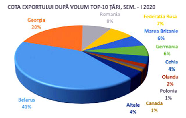 摩爾多瓦向56個(gè)國家和地區(qū)的出口總額為12.478億列伊, 比2019年前6個(gè)月下降了5.7%(即減少了7470萬列伊)。