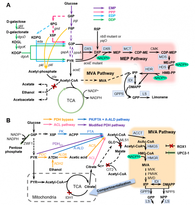 楊曉兵副教授團隊長期致力于利用代謝工程和合成生物學策略構(gòu)建高價值化合物細胞工廠的研究工作。目前,已利用代謝工程策略成功改造圓紅冬孢酵母(Rhodosporidium toruloides)構(gòu)建了檸檬烯等單帖化合物、羥基化脂肪酸、氨基酸衍生物的細胞工廠,其中檸檬烯微生物合成相關(guān)研究工作獲得陜西省面上基金(2020JM177)、學校科研啟動基金、國家級科創(chuàng)等支持,指導2016本科生任毓瑤畢業(yè)論文獲得校級畢業(yè)論文。該綜述介紹了微生物合成檸檬烯及其衍生物面臨的機遇與挑戰(zhàn),詳細闡述了異戊二烯途徑多樣性、代謝路徑關(guān)鍵酶的發(fā)掘與表征、宿主細胞代謝路徑的理性調(diào)控、輔因子平衡、檸檬烯及其衍生物生物毒性的解除及提升宿主微生物魯棒性的策略等內(nèi)容。本綜述詳盡討論了大腸桿菌、釀酒酵母、藍細菌和產(chǎn)油酵母等生產(chǎn)平臺菌株的優(yōu)勢與不足,為系統(tǒng)地理性改造微生物代謝網(wǎng)絡(luò)構(gòu)建單帖細胞工廠提供了科學參考。