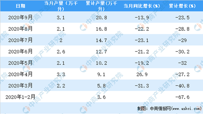 據(jù)中商產(chǎn)業(yè)研究院數(shù)據(jù)庫(kù)顯示,2020年9月全國(guó)葡萄酒產(chǎn)量增長(zhǎng),2020年9月全國(guó)葡萄酒產(chǎn)量為3.1萬(wàn)千升,同比下降13.9%。2020年1-9月全國(guó)葡萄酒產(chǎn)量為20.8萬(wàn)千升,同比下降23.5%。