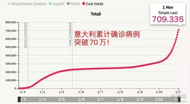 據(jù)意大利衛(wèi)生部11月1日公布的最新統(tǒng)計(jì)數(shù)據(jù),過去24小時意大利全國新增新冠病毒感染病例29907例,累計(jì)感染709335例;新增死亡208例,累計(jì)死亡38826例;累計(jì)治愈292380例,其中新治愈2954例。