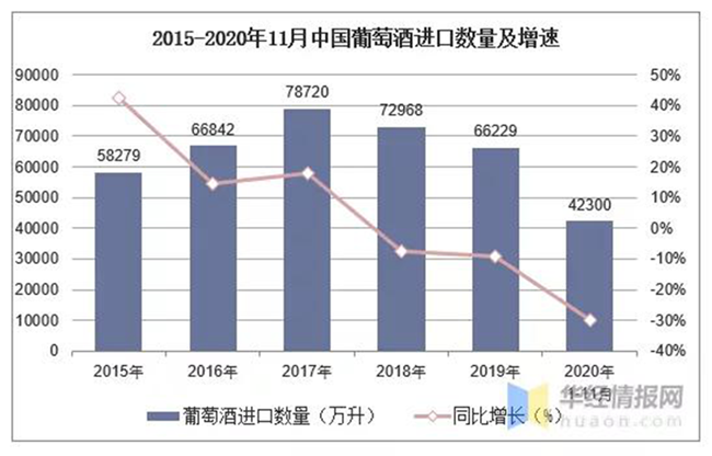 2015-2020年11月中國葡萄酒進(jìn)口數(shù)量及增速