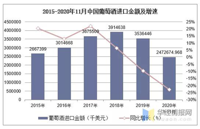 2015-2020年11月中國葡萄酒進(jìn)口金額及增速
