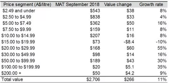“在截止到9月30日的一年內(nèi),各個(gè)價(jià)格區(qū)間內(nèi)都有良好增長。10澳元/升及以上的葡萄酒出口額增長了20%至8.04億澳元,而20到29.99澳元之間的葡萄酒增長尤其迅猛。10澳元/升以下的葡萄酒當(dāng)中,5到7.49澳元區(qū)間增速明顯,增長了5000萬澳元。”