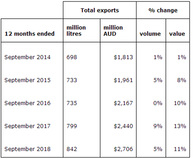 澳大利亞葡萄酒對(duì)全球出口額和出口總量持續(xù)走強(qiáng)。截止到2018年9月30日的一年中,澳大利亞葡萄酒出口總額增長11%至27.1億澳元,出口總量增長5%至8.42億升(或900萬箱9升裝,見表2)。