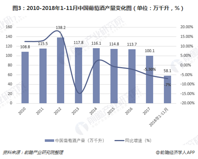 我國葡萄酒產(chǎn)量從2012年達到138.2萬千升的歷史高峰開始,一直在緩慢連續(xù)滑坡。根據(jù)國家統(tǒng)計局數(shù)據(jù),2017年,全國葡萄酒產(chǎn)量100.1萬千升,累計下降5.3%;2018年1-11月,全國葡萄酒產(chǎn)量達58.1萬千升,累計下滑7%,若要趕超上年產(chǎn)量,12月的產(chǎn)量至少要達到42萬千升,而此數(shù)字比2018年前8個月的產(chǎn)量之和還多。結(jié)合目前數(shù)據(jù)看來,2018年國產(chǎn)葡萄酒產(chǎn)量大幅下滑已成定勢。