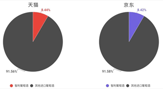 在天貓和京東兩大電商平臺(tái)上,智利葡萄酒的酒款數(shù)量占比均為8.4%,非常一致;此外,兩大平臺(tái)不同價(jià)位的智利葡萄酒分布也相對(duì)接近──低端智利酒的占比略低,而中高端的酒款數(shù)量比起意大利等競爭對(duì)手來說則明顯占比更高。