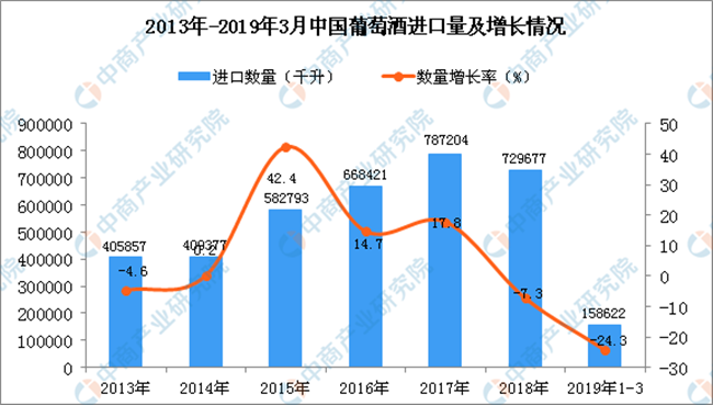 據(jù)中商產(chǎn)業(yè)研究院數(shù)據(jù)庫顯示,2013年-2017年中國葡萄酒進(jìn)口量增長,共增長381347千升,增長93.96%;2018年中國葡萄酒進(jìn)口量回落,2019年1-3月中國葡萄酒進(jìn)口量為158622千升,同比下降24.3%。