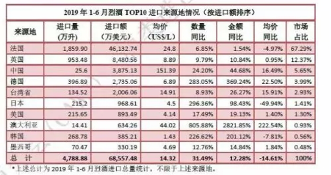 數(shù)據(jù)顯示,在過(guò)去5年中,全球烈酒市場(chǎng)以平均每年4.7%的速度增長(zhǎng),預(yù)計(jì)到2020年,市場(chǎng)消耗量仍將增加1.2億箱,突破32億箱大關(guān),其中,增長(zhǎng)的最大份額將來(lái)自中國(guó)。從酒類(lèi)進(jìn)出口商分會(huì)公布的數(shù)據(jù)來(lái)看,2019年上半年,烈酒進(jìn)口量實(shí)現(xiàn)了超三成的增長(zhǎng),進(jìn)口額也實(shí)現(xiàn)了12.28%的增長(zhǎng)。從來(lái)源國(guó)來(lái)看,法國(guó)均價(jià)下降4.97%,但進(jìn)口量繼續(xù)保持增長(zhǎng),市場(chǎng)占比仍據(jù)首位;英國(guó)量額增幅有一定下滑,但仍居第二;日本、澳大利亞、韓國(guó)延續(xù)高速增長(zhǎng)。