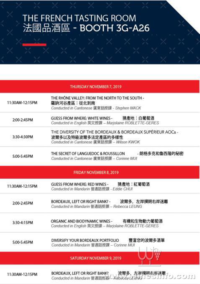 今年酒界盛事香港國(guó)際美酒展(11 月 7 至 9 日)將迎來(lái) 70 多家法國(guó)展商。佔(zhàn)地約 513 平方米的法國(guó)館位于香港會(huì)議展覽中心 3F-G,由法國(guó)商務(wù)投資署(Business France)及新阿基坦大區(qū)食品協(xié)會(huì) (AANA)籌辦。在香港市場(chǎng)排名第一的法國(guó)葡萄酒和烈酒分別佔(zhàn) 60%及 40%市場(chǎng)份額。 French Tasting Room 品酒區(qū)繼去年成功推出后,今年將重現(xiàn)法國(guó)館。法國(guó)展商將在共 9 場(chǎng)主題品酒環(huán)節(jié)上陳列各款佳釀,這對(duì)于進(jìn)口商、專(zhuān)業(yè)人士及業(yè)馀愛(ài)好者來(lái)說(shuō)是一個(gè)難能可貴的大滿(mǎn)足機(jī)會(huì),品嚐出產(chǎn)自法國(guó)的純釀。
