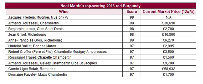 Martin總結(jié):“勃艮第的頂級與其它葡萄酒之間,它們的質(zhì)量差距遠小于其市場價格差距”。 下表列出了最高得分的2016年份勃艮第葡萄酒及其目前市場價格。