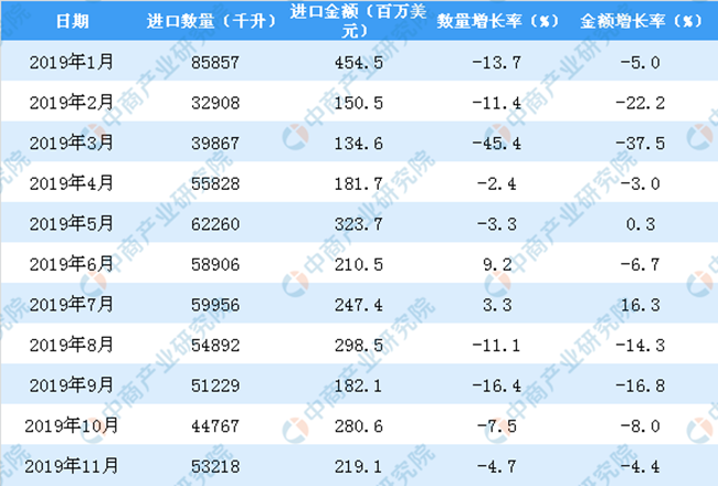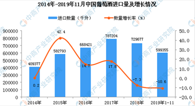 據(jù)中商產(chǎn)業(yè)研究院數(shù)據(jù)庫顯示,2014-2017年中國葡萄酒進(jìn)口量逐漸增長,2018年中國葡萄酒進(jìn)口量有所下降;2019年1-11月中國葡萄酒進(jìn)口量為599355千升,同比下降10.6%。