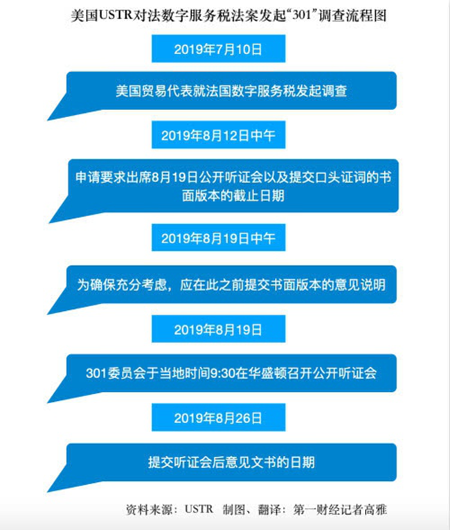 USTR在對(duì)法“301調(diào)查”后,認(rèn)定法國(guó)數(shù)字服務(wù)稅歧視美國(guó)企業(yè),擬向63項(xiàng)總價(jià)值為24億美元的法國(guó)輸美產(chǎn)品加征最高100%的關(guān)稅,USTR此前還特地在聲明中指出,在聽(tīng)證會(huì)后,希望“迅速進(jìn)行征稅等活動(dòng)”。