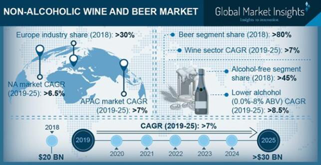 根據(jù)全球市場洞察(Global Market Insights)2019年發(fā)布的報(bào)告,2018年無醇葡萄酒和無醇啤酒市場規(guī)模為200億美元,預(yù)計(jì)從2019年到2025年,年復(fù)合增長率將超過7%,達(dá)300億美元,以下是部分?jǐn)?shù)據(jù):