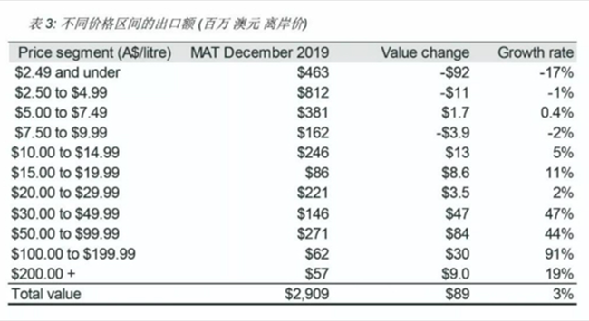 價(jià)格低于2.5 澳元/升(離岸價(jià))的澳洲葡萄酒出口額下降最為明顯,降低了17%至4.63 億澳元。