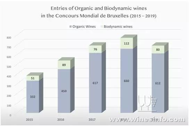 有機(jī)葡萄酒和生物動(dòng)力法葡萄酒的參賽酒款數(shù)量(2015年至2019年)