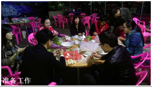 25號當天,負責采購的同事根據(jù)大家寫好的菜單,提前采購好所需要的雞、鴨、魚、肉、蔬菜等各色原料,以及油鹽醬醋等各種調味品,開始做好活動前的各項準備工作。當天下午5點,大家在公司領導莊總、劉總、曾總的帶領下,陸續(xù)到達活動現(xiàn)場——位于南城水濂山腳下順風山莊內(nèi)的蒙之味烤全羊原生態(tài)KTV燒烤廣場。