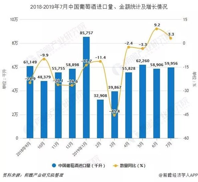 據(jù)中國海關(guān)總署數(shù)據(jù)顯示,2019年1-2季度中國葡萄酒進(jìn)口量有所增長,2019年7月中國葡萄酒進(jìn)口量為59956千升,同比增長3.3%。累計方面,2019年1-7月中國葡萄酒進(jìn)口量達(dá)到395429千升,同比下降10.8%。