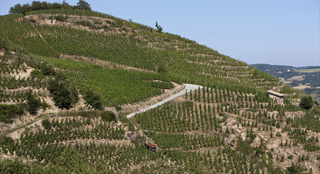 在北羅納河谷葡萄園,河流流經(jīng)之處多為狹窄的峽谷和陡峭的山坡,因此葡萄園也更多地種植在靠近河流的陡坡上。由于離海洋較遠(yuǎn),北羅納河谷葡萄園以大陸性氣候為主,但又多多少少會受到地中海(Mediterranean)氣候的影響,夏季炎熱干燥,冬季寒冷少雨。這里的土壤以礫石、頁巖和石灰?guī)r為主,排水性能優(yōu)越。這樣一來,種植在山坡上的葡萄藤可以更好地接收生長季充足的陽光,再加上排水性良好的土壤,有助于葡萄果實更好地成熟。北羅納河谷葡萄園著名的子產(chǎn)區(qū)羅第丘(Cote Rotie)的產(chǎn)區(qū)名在法語中意為“被炙烤的山坡”,就很形象地描繪了這一風(fēng)土特點。