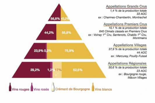 與波爾多完全不同的是,勃艮第并不是以酒莊為分級(jí)方法,而是以土地的位置為來(lái)進(jìn)行,表現(xiàn)如金字塔般垂直走向的方式,以原產(chǎn)地為命名系統(tǒng)(AOC)建立形成,井然有序的分級(jí)制度一直保存至今。