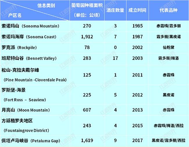 索諾瑪縣擁有多達(dá)17個(gè)AVA子產(chǎn)區(qū),每個(gè)產(chǎn)區(qū)都擁有自己獨(dú)特的歷史、地理?xiàng)l件和代表品種,以下兩個(gè)表格是索諾瑪縣子產(chǎn)區(qū)的基本信息概況。