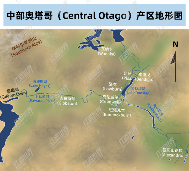 中部奧塔哥共劃分為六個(gè)子產(chǎn)區(qū),分別是:瓦納卡(Wanaka)、吉布斯頓(Gibbston)、班諾克本(Bannockburn)、亞歷山德拉(Alexandra)、本迪戈(Bendigo)以及克倫威爾/洛本/比薩(Cromwell/Lowburn/Pisa)產(chǎn)區(qū)。