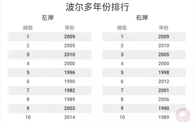 實(shí)際上,在波爾多的左岸和右岸地區(qū),同一年份的表現(xiàn)也略有不同(見下圖)。