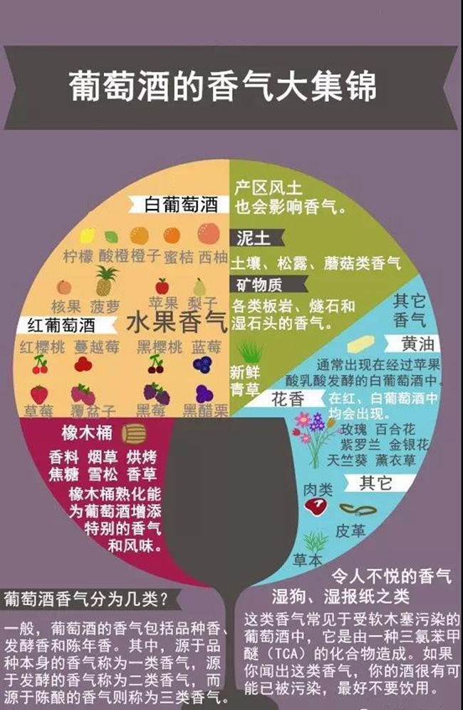在葡萄酒的世界中至少存在著上百種不同的氣味。不是所有氣味都是容易識別的。為了鑒別,品酒師把這些氣味進行分類重組。每組類別的定義及其包含的氣味各不相同,如水果可以分為柑橘類、紅色水果、黑色水果、熱帶水果等,糕點類可以分為黃油、餅干、奶油面包、吐司等,另外還有花卉類、木質(zhì)類、糖果類、植物類、香料類、動物類和礦物類等,每一個類別你需要有一些香氣記憶的儲備(詳見附圖)。
